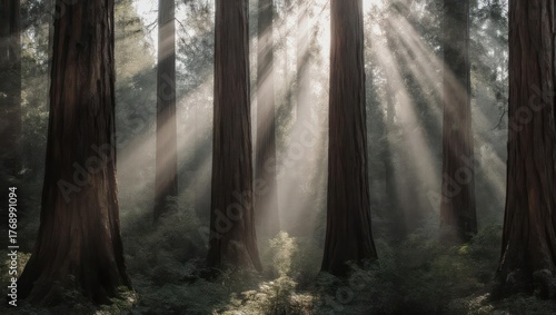 © Gedel, Naklejka premium Sunlight streams through a redwood forest
