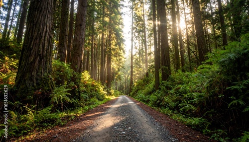 © Suaib, Obraz premium Sunlight streams through a redwood forest on a gravel road.