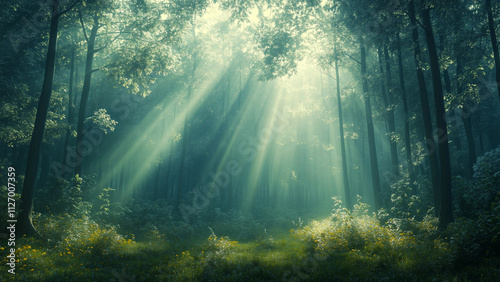 © Dada635, Fototapeta premium Sunlight streams through a serene woodland