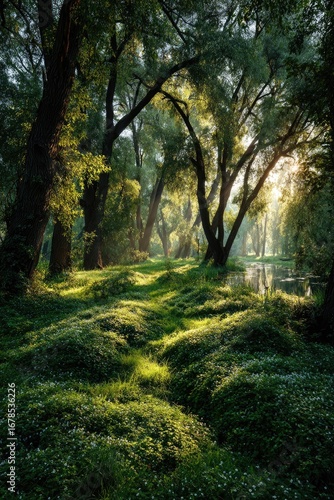 © Muhammad, Fototapeta premium Sunlight streams through a tranquil forest