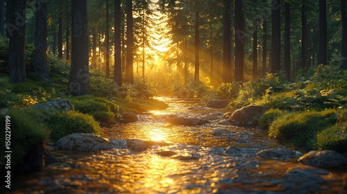 Obraz premium Sunlight streams through a tranquil forest creek