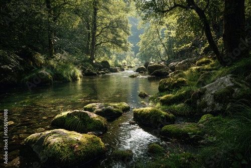 © aisar, Fototapeta premium Sunlight streams through a verdant forest, illuminating a clear mountain stream