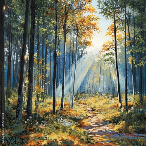 © Ibnu, Obraz premium Sunlight streams through a vibrant forest path