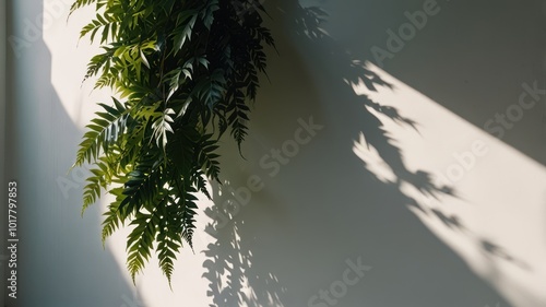© kucret, Obraz premium Sunlight streams through a window, casting long shadows of a hanging fern on a white wall.