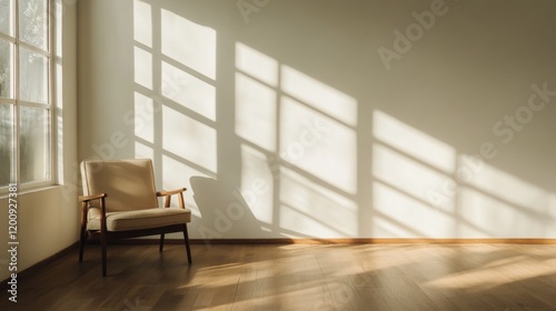© musa, Obraz premium Sunlight streams through a window, casting shadows on a wall in a minimalist room with a single armchair.