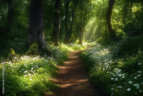 Obraz premium Sunlight streams through a woodland path, carpeted in wildflowers