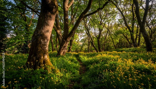 © Bandi, Fototapeta premium Sunlight streams through a woodland path filled with wildflowers