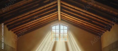 © rashyn, Obraz premium Sunlight streams through attic window, wooden beams