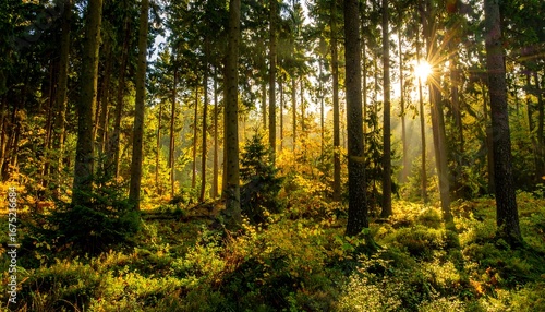 © Tahu, Obraz premium Sunlight streams through autumn forest