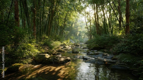 Obraz premium Sunlight streams through bamboo forest