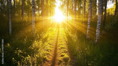 © ADIFERI, Fototapeta premium Sunlight streams through birch trees (2)