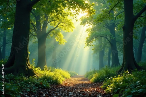 © ORAWAN, Naklejka premium Sunlight streams through canopy, dappling forest floor , environment, floor, foliage