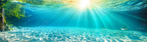 Fototapeta premium Sunlight streams through clear water, illuminating sandy riverbed and creating serene underwater scene. fish swims peacefully, adding life to tranquil aquatic environment