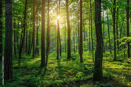 Obraz premium Sunlight streams through dense forest. Perfect for illustrating articles...