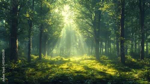 © Ali, Obraz premium Sunlight streams through dense forest trees.
