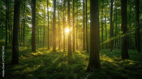 © Nikmah, Obraz premium Sunlight streams through forest canopy at dawn. Possible use Nature background