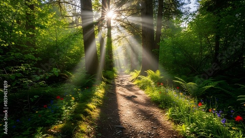 © Arafat, Obraz premium Sunlight streams through forest canopy illuminating a winding path