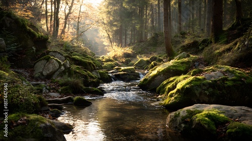 Obraz premium Sunlight Streams Through Forest Canopy Over Mossy Stream and Rocks.