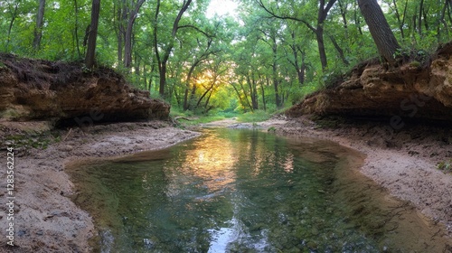 Obraz premium Sunlight streams through forest creek bed