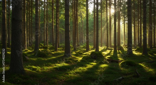 © Ney, Obraz premium Sunlight streams through forest trees creating a tranquil woodland scene