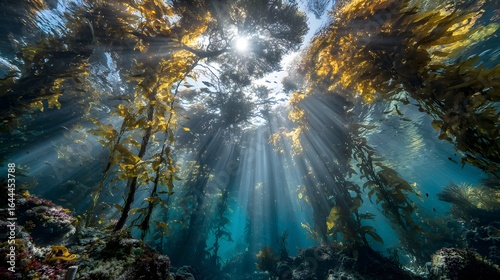© Reyhan, Fototapeta premium Sunlight streams through kelp forest underwater.