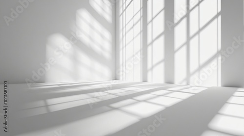 Obraz premium Sunlight streams through large windows, casting intricate shadow patterns on the pristine white floor and walls of an empty, minimalist interior space.