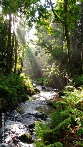 © Mangku, Fototapeta premium Sunlight streams through lush forest canopy onto a babbling brook
