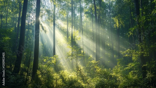 © MySamLobatobrock, Obraz premium Sunlight streams through misty forest