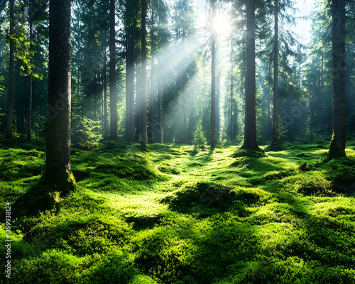 © FANSISCA, Obraz premium Sunlight Streams Through Misty Forest