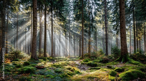 Obraz premium Sunlight streams through misty forest