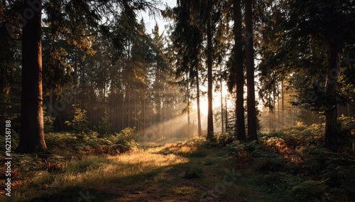 © Neni, Obraz premium Sunlight streams through misty forest at dawn