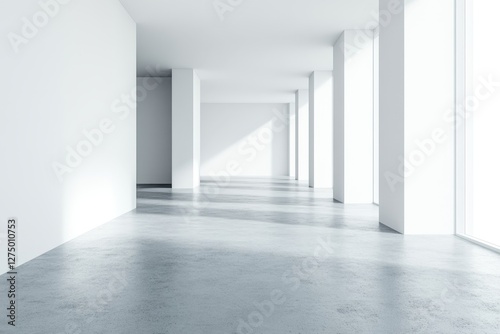 © Yusnira, Obraz premium Sunlight streams through modern office hallway windows