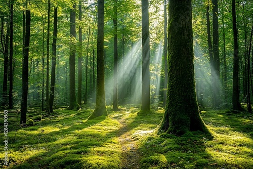 © rashyn, Fototapeta premium Sunlight streams through mossy forest