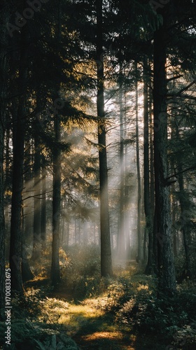 Fototapeta premium Sunlight streams through serene trees