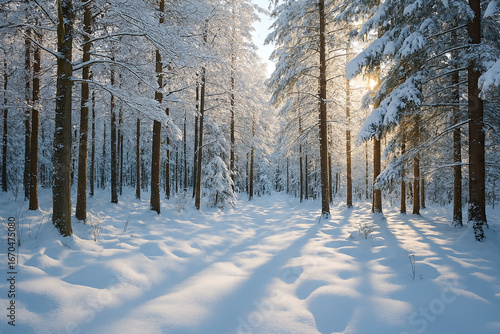© MdShahajan, Fototapeta premium Sunlight streams through snow covered pine trees in a serene winter forest landscape