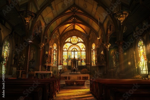 Obraz premium Sunlight streams through stained glass in a historic church interior