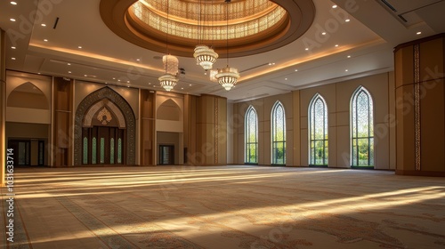© Ali, Obraz premium Sunlight streams through stained glass windows in a grand hall.
