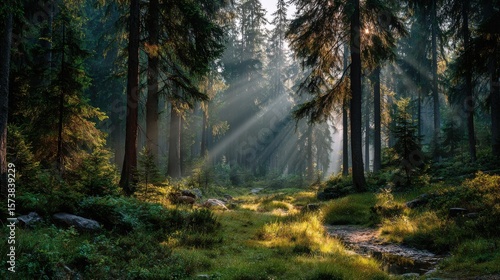 Fototapeta premium Sunlight streams through tall pine trees, illuminating a serene forest floor...