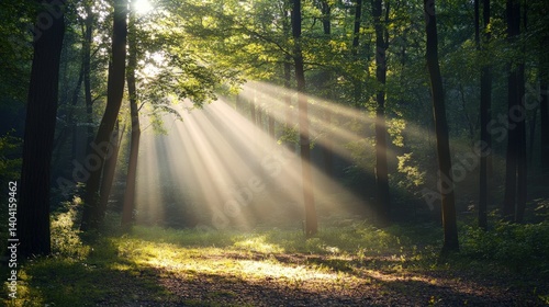 © Adip, Obraz premium Sunlight streams through tall trees creating a magical forest scene
