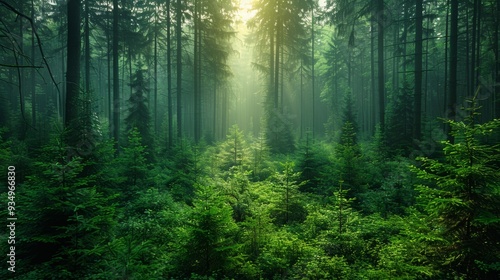 Obraz premium Sunlight streams through tall trees in a dense green forest during early...