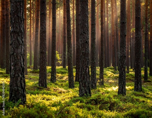 Obraz premium Sunlight streams through tall trees in a lush, green forest floor