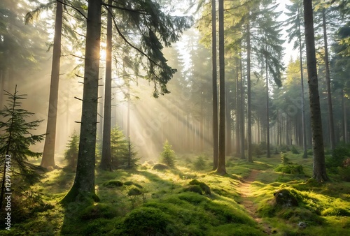 Obraz premium Sunlight streams through tall trees in a lush green forest with moss-covered...
