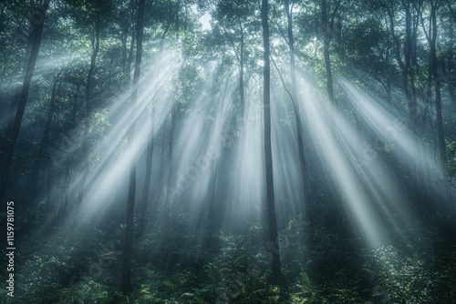 Obraz premium Sunlight streams through tall trees in a serene forest during early morning...