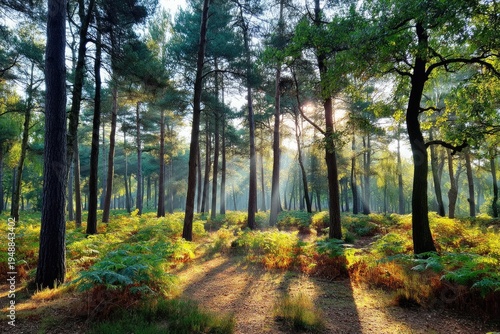 © Ibnu, Fototapeta premium Sunlight streams through tall trees in a vibrant, verdant forest, casting long shadows