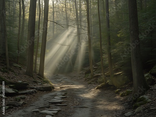 © yogiandrias, Obraz premium Sunlight streams through tall trees on a peaceful forest path