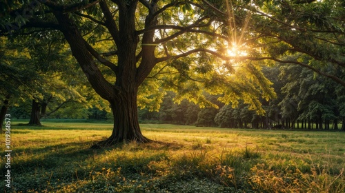 © LAYHONG, Obraz premium Sunlight streams through the branches of a large tree in a peaceful park, casting a warm golden glow over the grassy field..