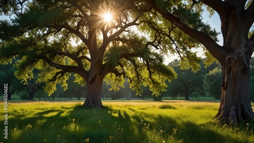 © ikk.gtg, Obraz premium Sunlight streams through the branches of two large oak trees in a grassy meadow.