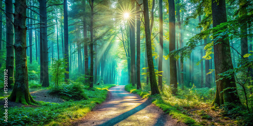 Naklejka premium Sunlight streams through the canopy of tall trees, illuminating a peaceful forest path. The scene captures the tranquility of nature at dawn with vibrant colors and soft light