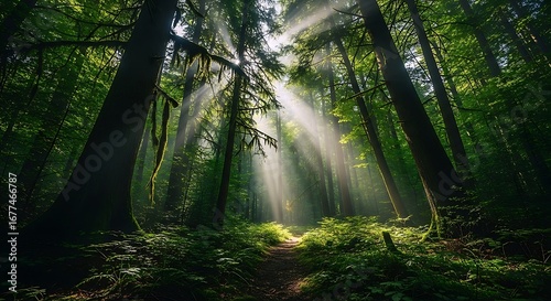 Obraz premium Sunlight Streams Through The Dense Canopy Of A Lush Green Forest, Illuminating A Winding Path On The Mossy Floor. A Peaceful Nature Scene.