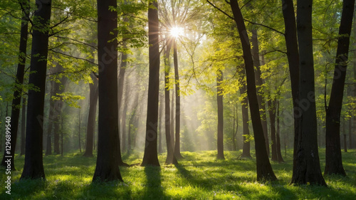 © demzp, Obraz premium Sunlight streams through the forest canopy, creating a serene and idyllic woodland scene.